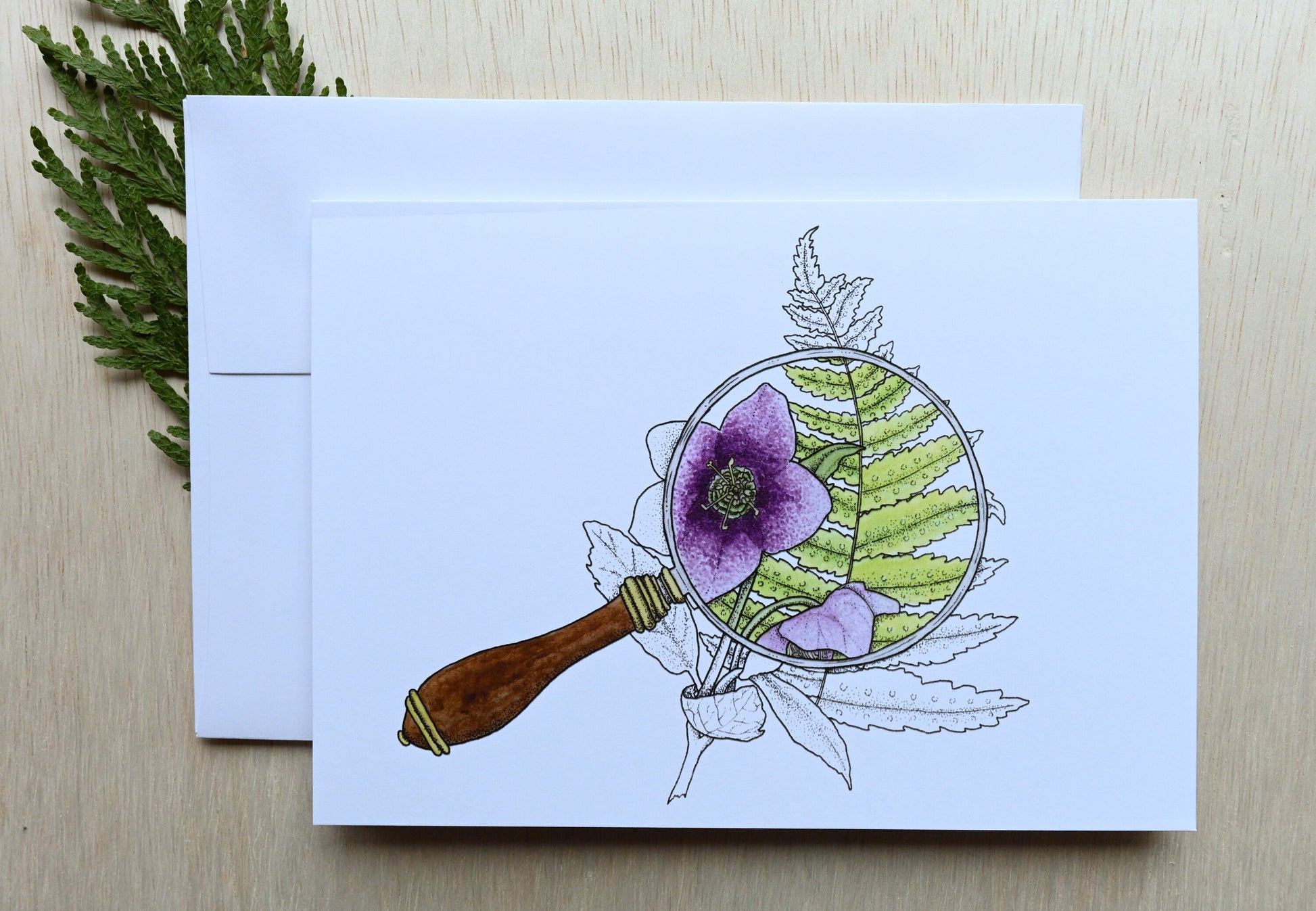 Send a unique piece of art to your loved ones in the mail with this illustrated ink and watercolor card. It's reminiscent of 19th century explorers and naturalists with a depiction of an old-fashioned magnifying glass and hellebore flower and fern.